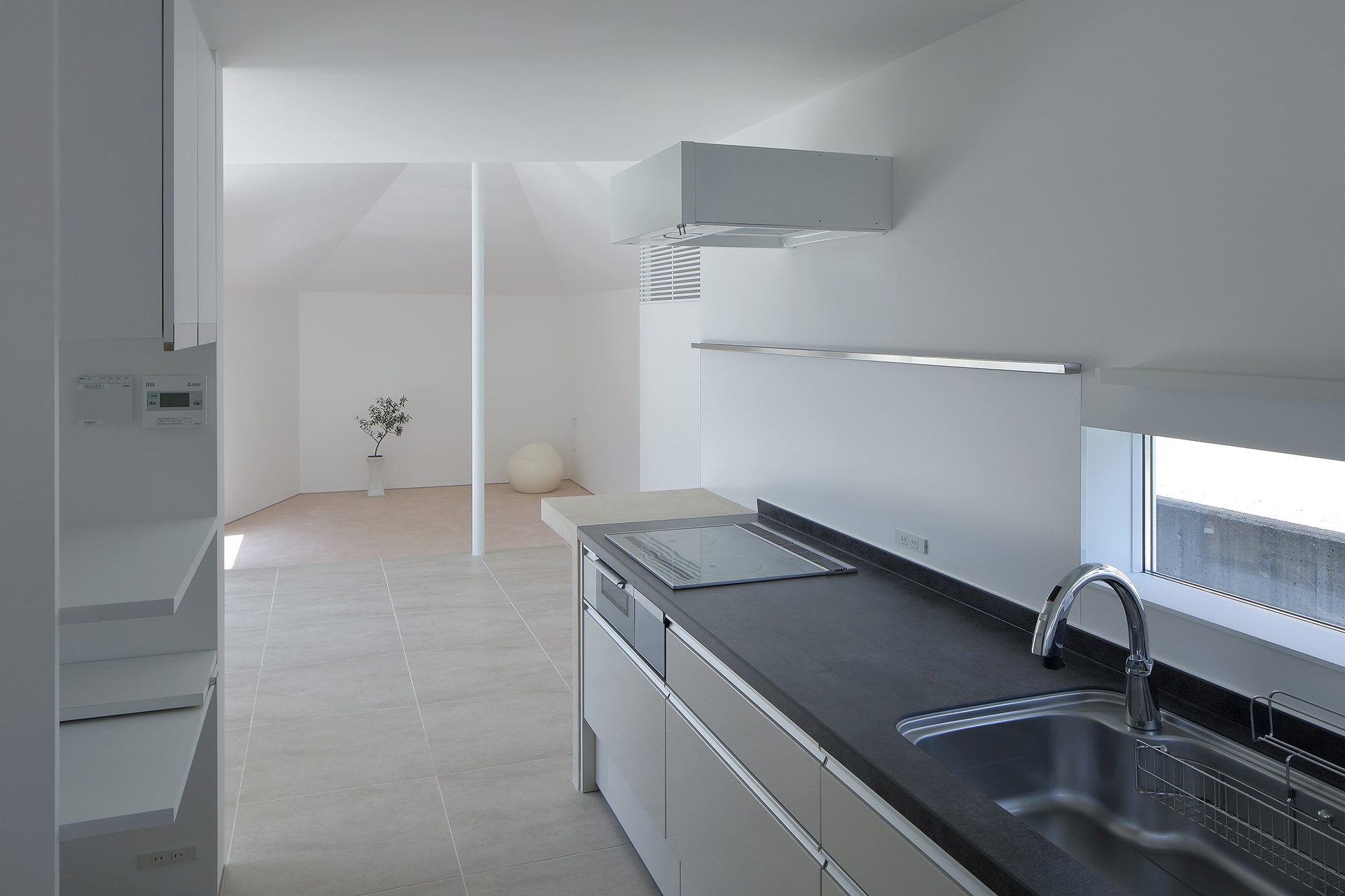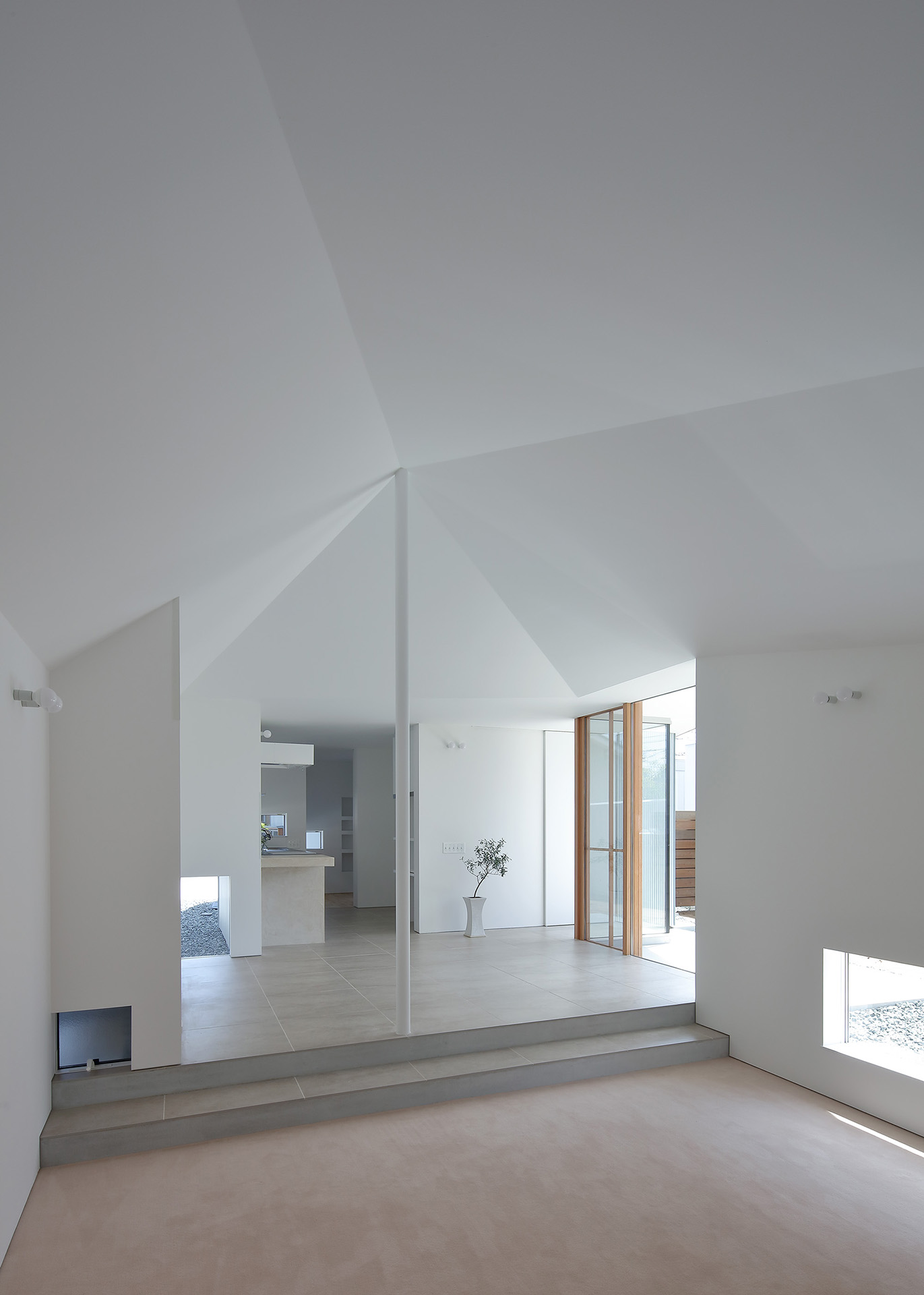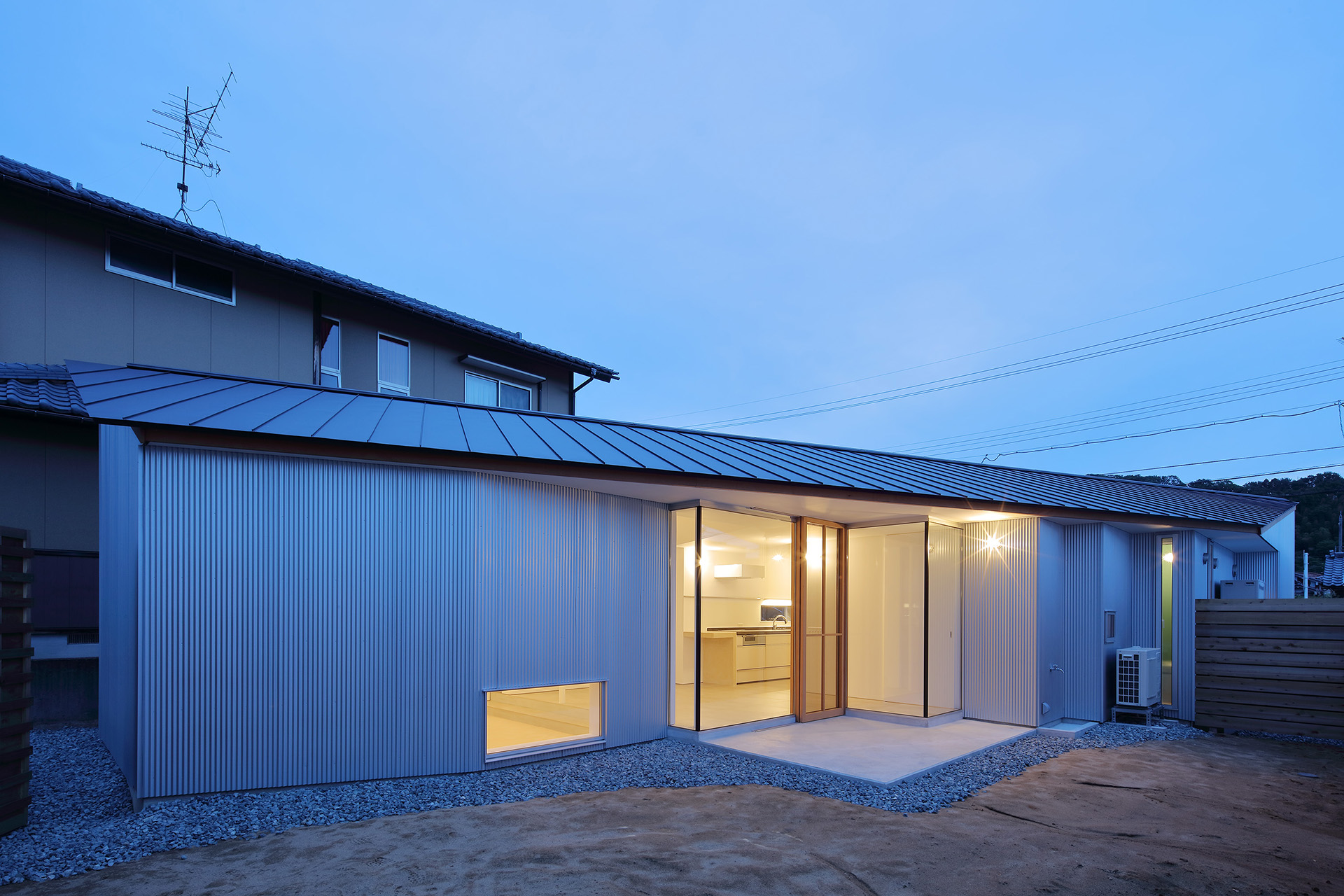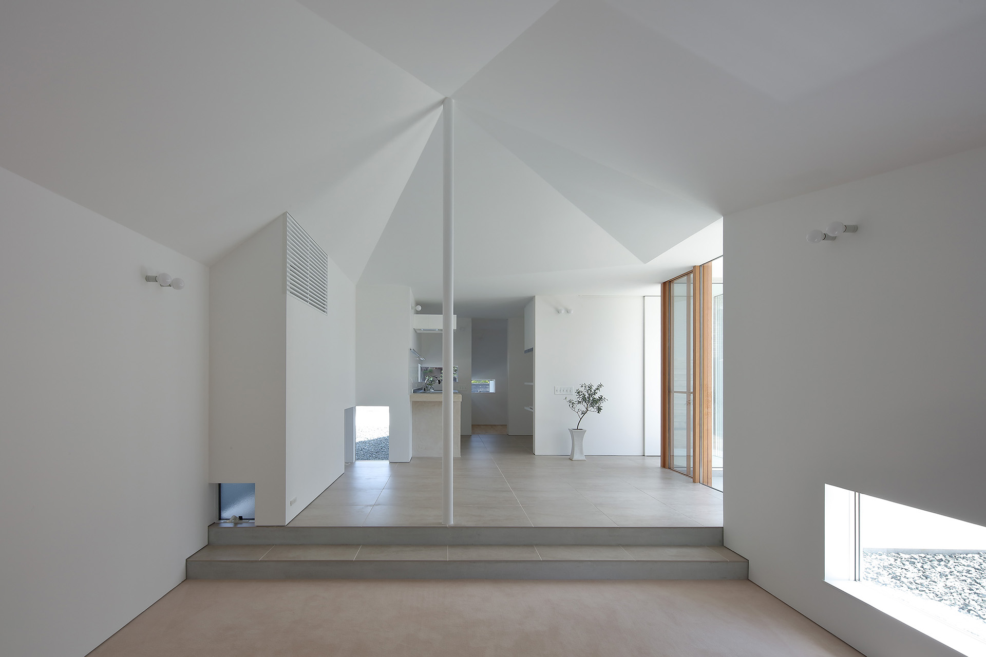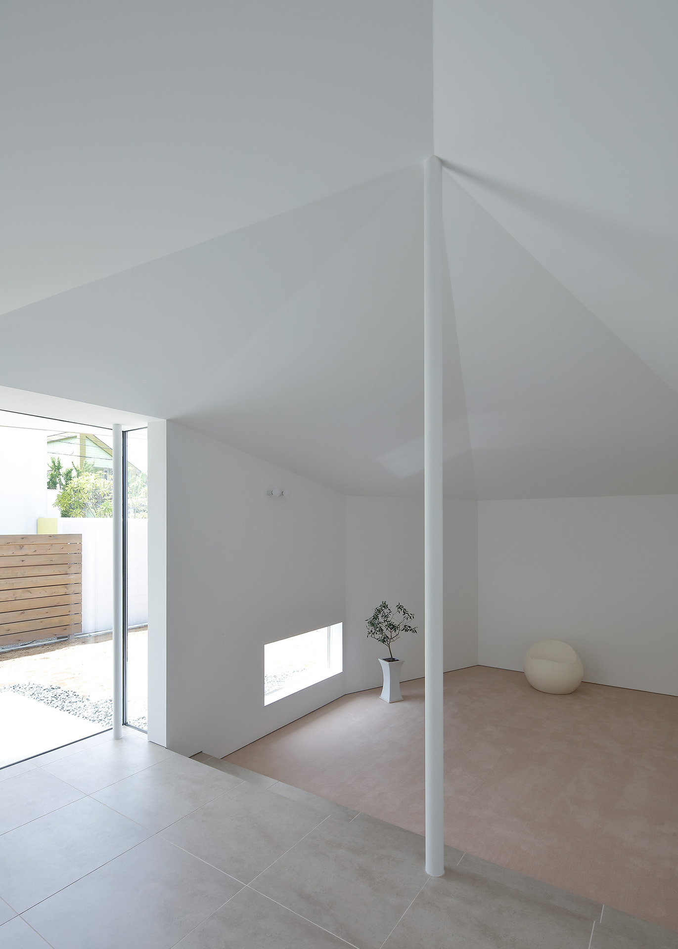 A simple gable roof was chosen so that the line of building runs diagonally across the site. The pillar between the living room and the dining room creates a vertical line of sight, dividing and tightening the contiguous space.