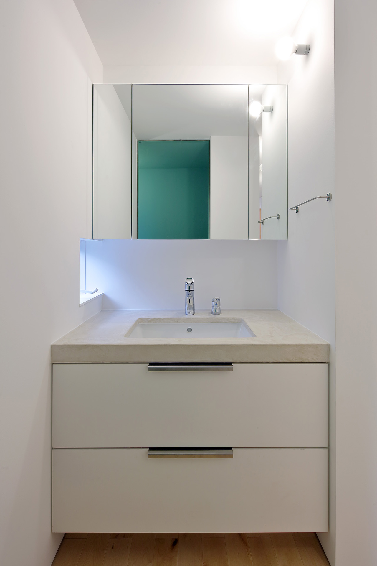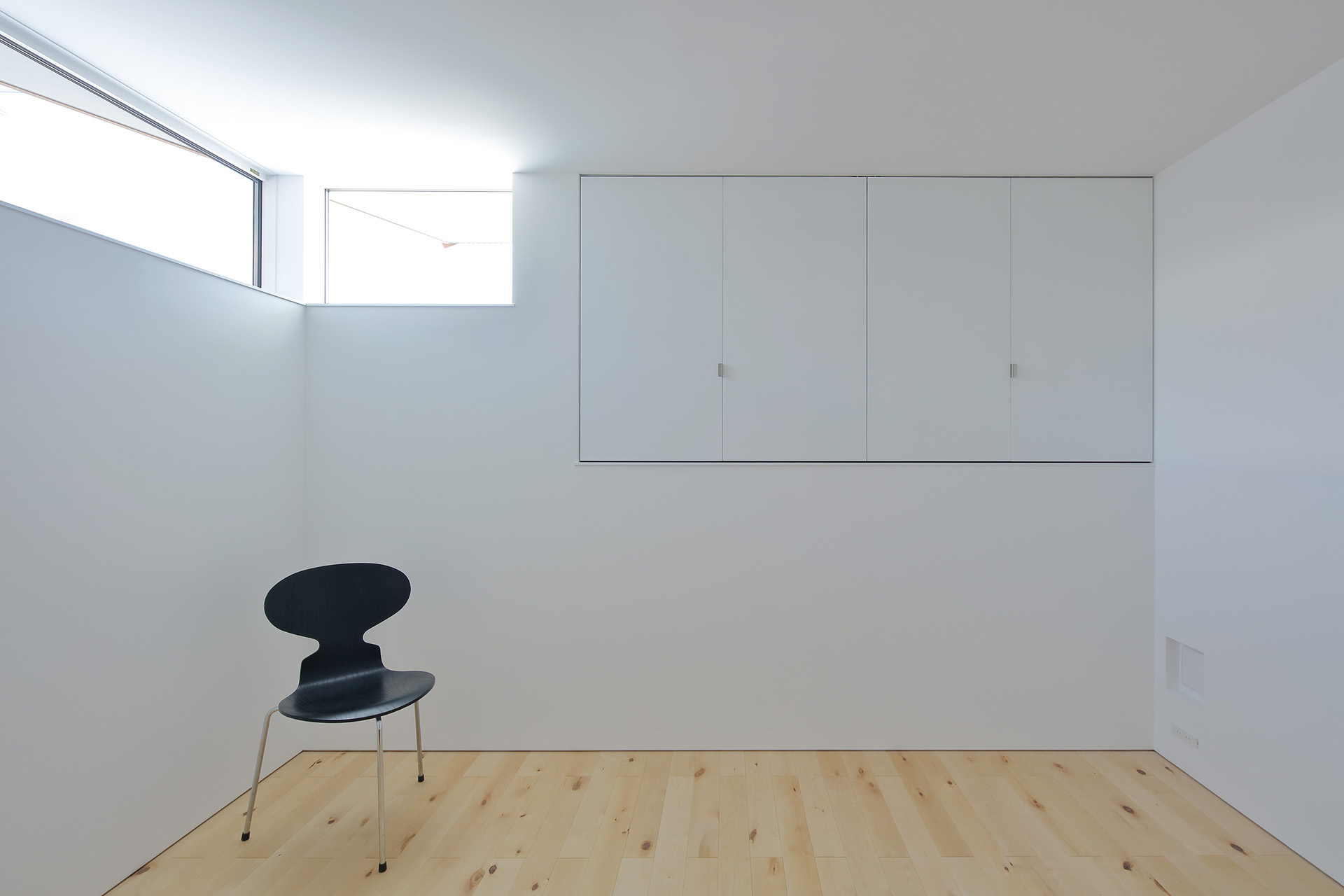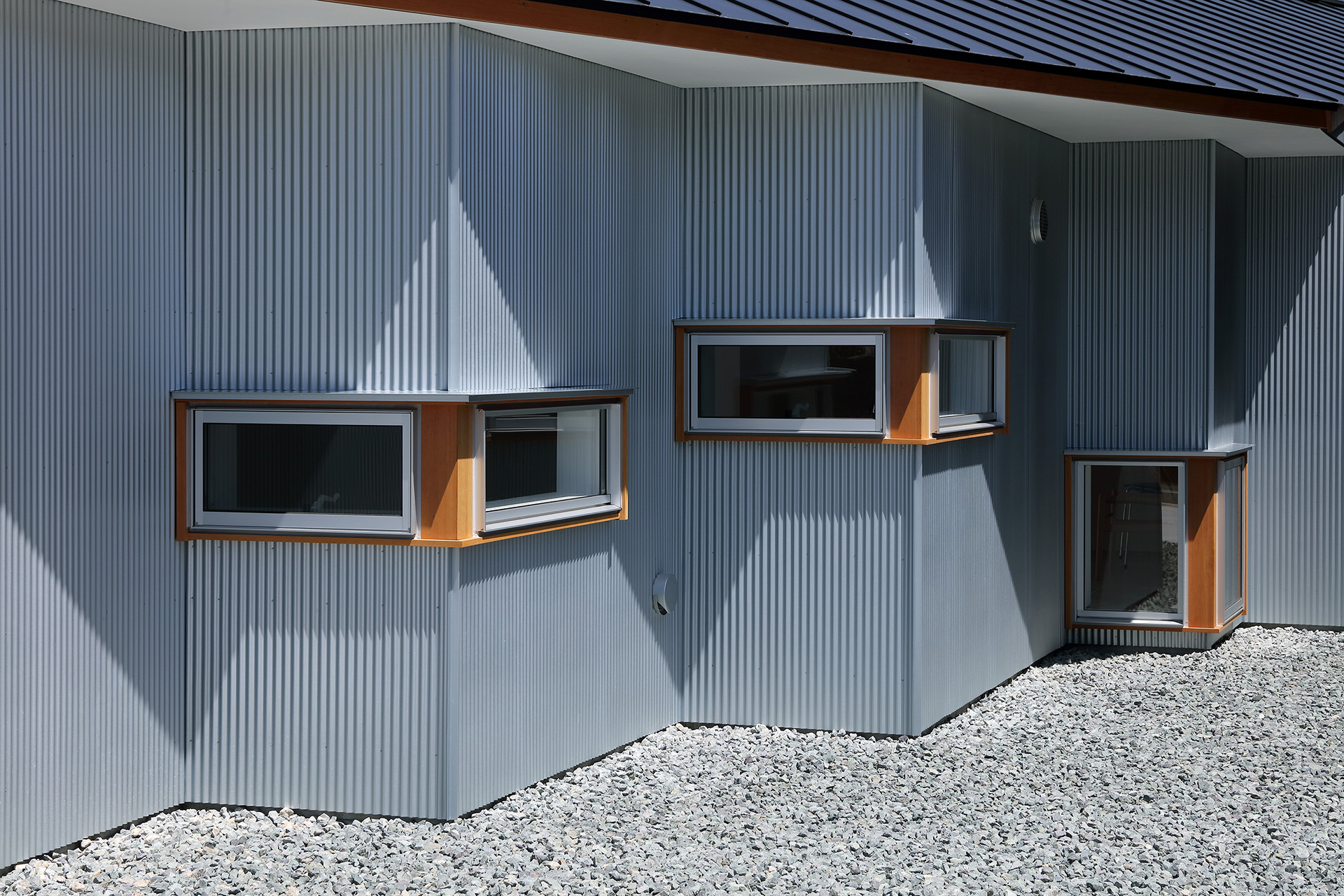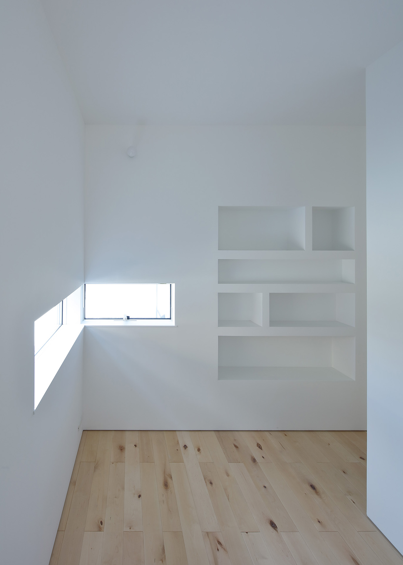 軒の陰影や外観のリズムを意識しつつ、それぞれの部屋に合った日が入るよう、窓の高さを工夫しながらクランク状の平面を計画した。また、奥へ行くほどプライベート性が上がる間取りになっており、一段下がったリビングを落ち着きのある場所とした。