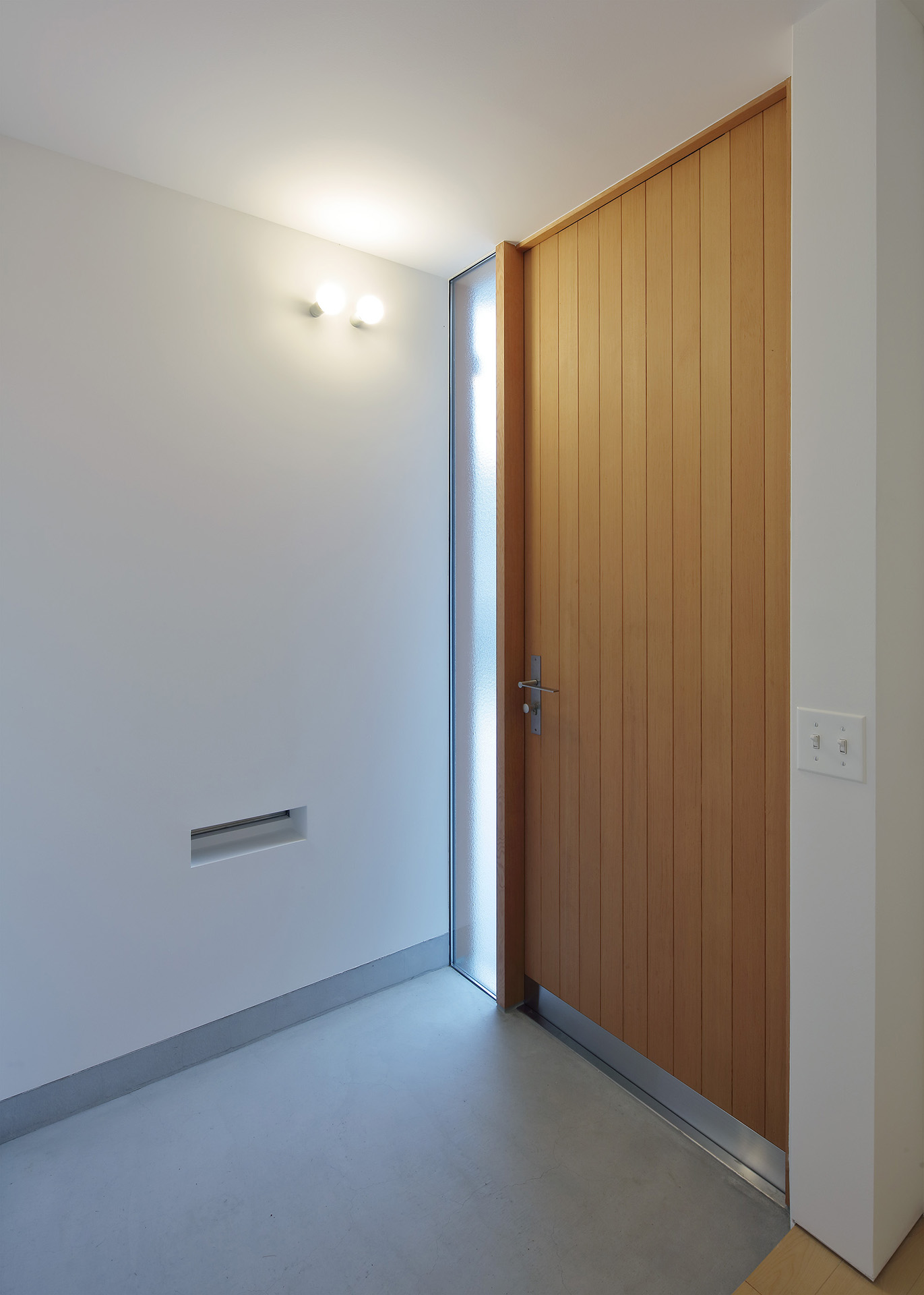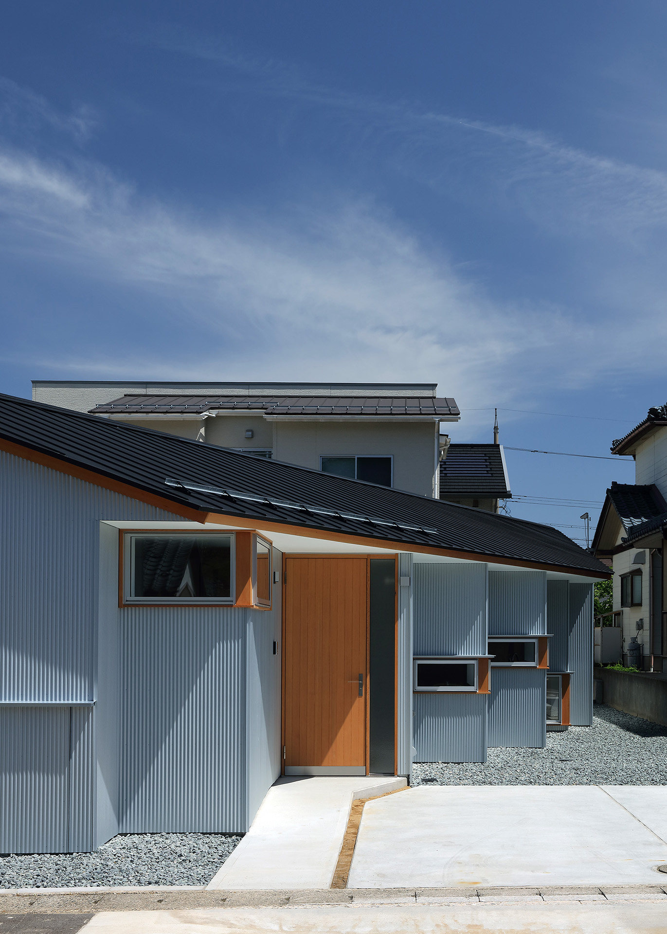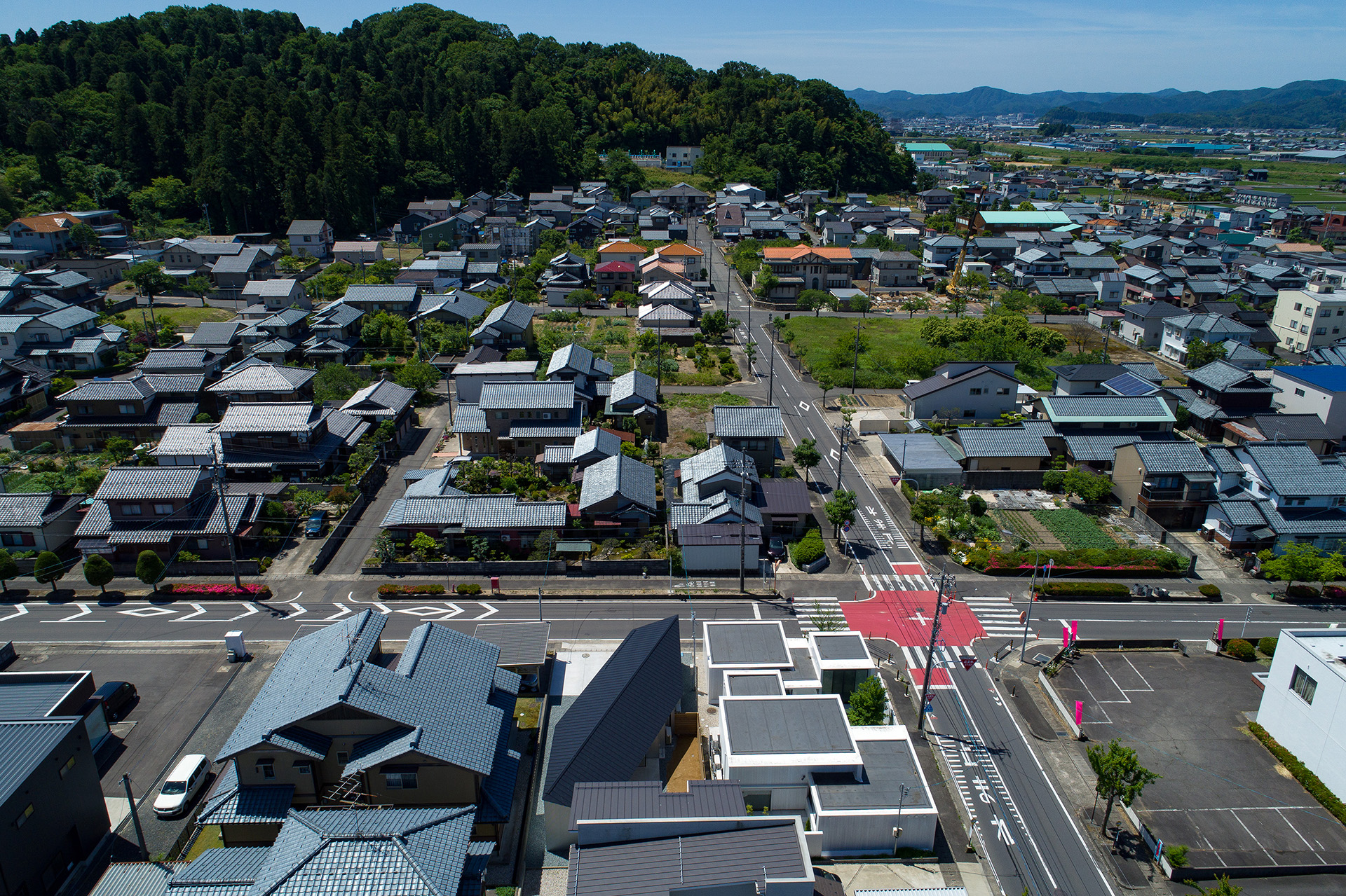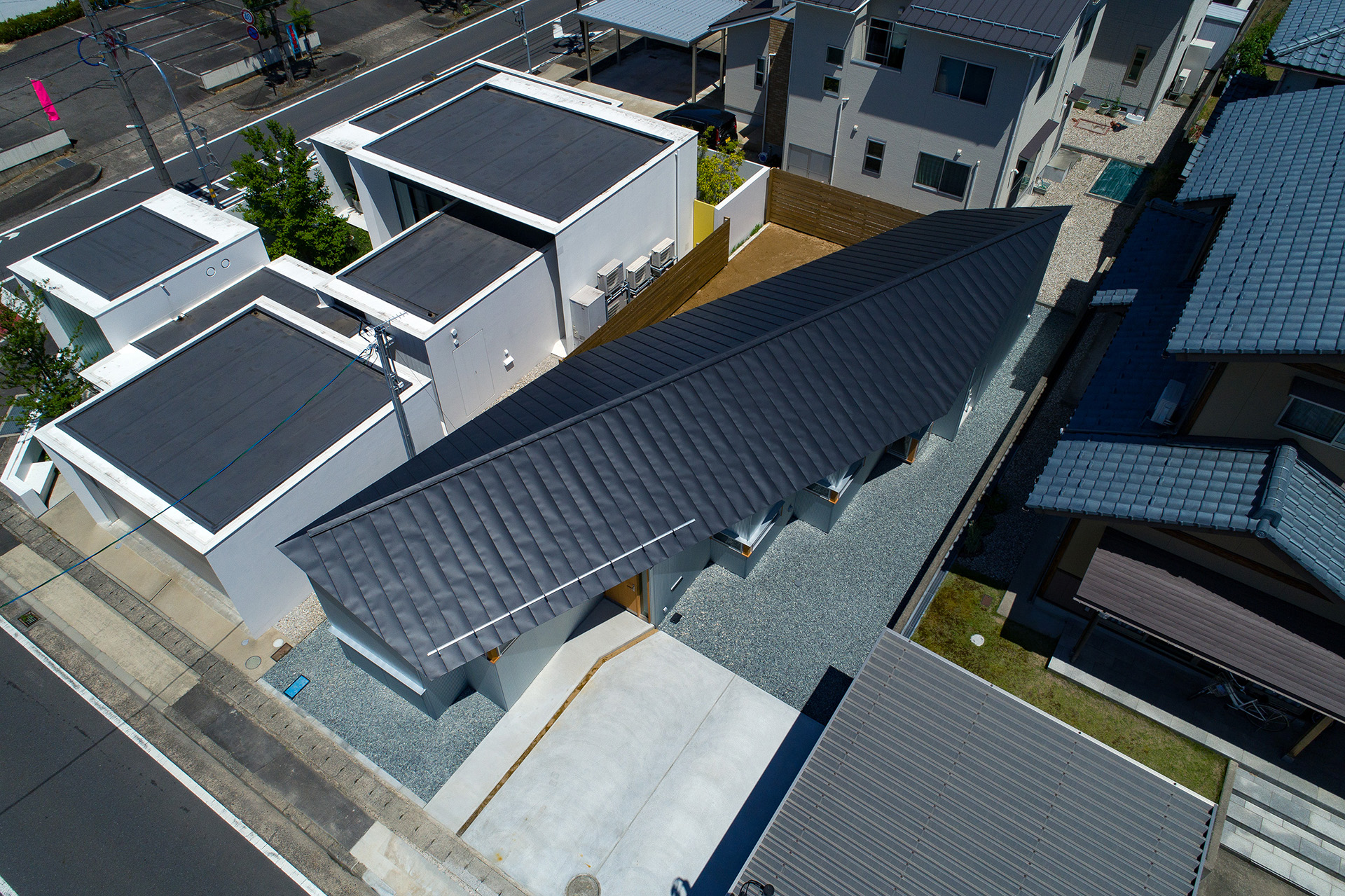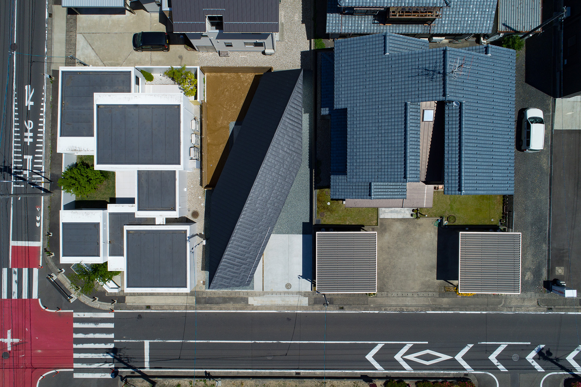 道路側に開けた南側を駐車場、奥まった北側に庭を設け、敷地を斜めに分けるように住宅を配置した。室内から庭を眺める際に隣家の庭が借景になるよう、周辺の風景との調和についても考慮した。